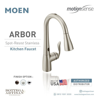 Moen's Arbor faucet is tailored to perfection. The flair of the handle and curve of the spout creates a transitional look that works with all decorating styles. A single hole mount creates the cleanest look against custom counter-tops.