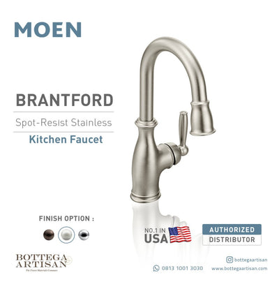 Brantford kitchen and bar/prep faucets make a traditionally styled space feel truly finished. The spout enhances the curvature of the faucet body and handle for a beautiful, polished look.